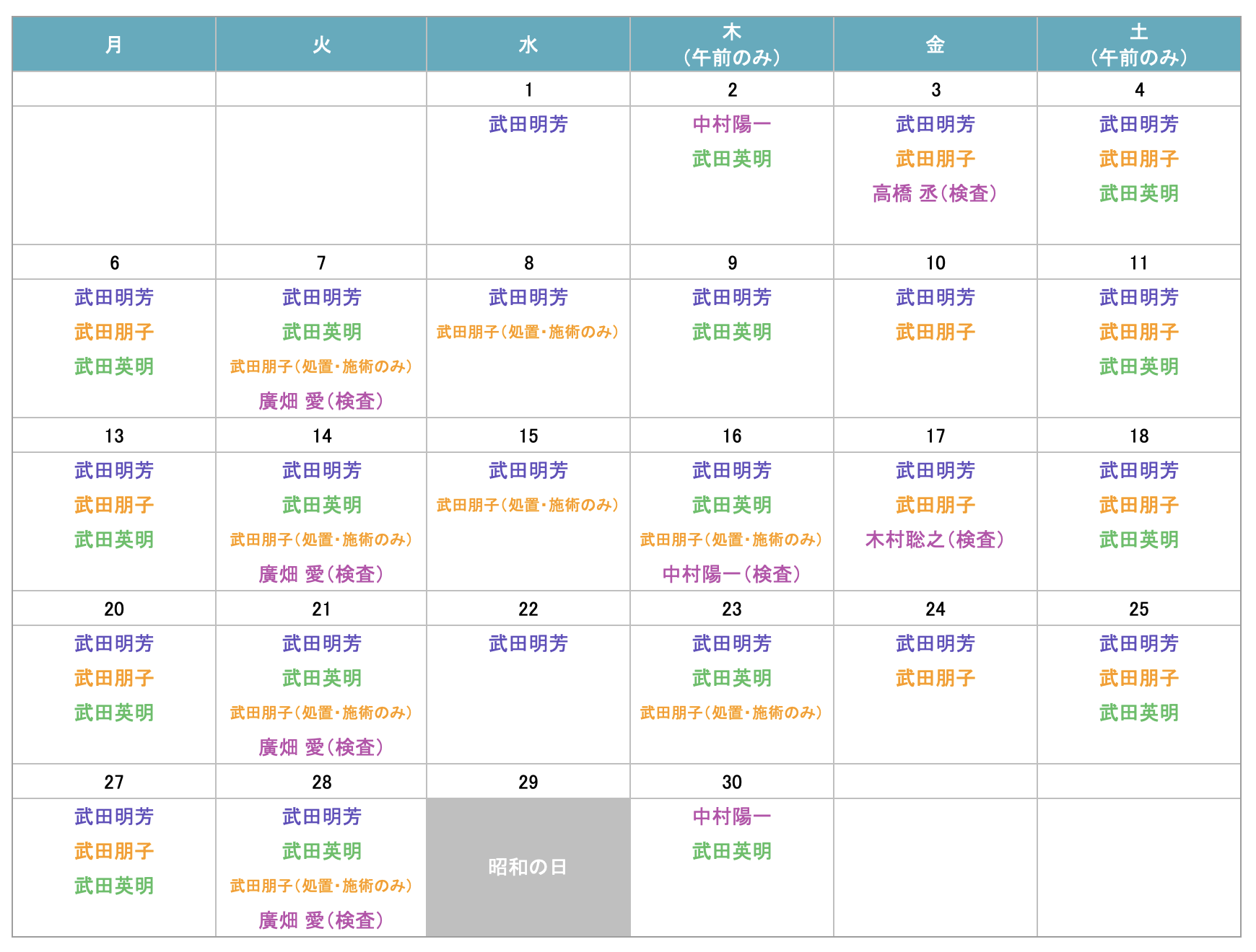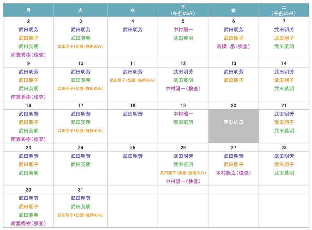 | 武田 明芳 | 外科、内科、胃腸科、肛門科、消化器内視鏡、腹部超音波、整形外科 |