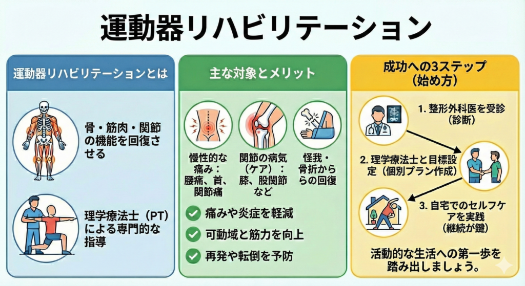 「痛みを根本から改善したい」「動ける体を取り戻したい」とお考えの方は、ぜひご相談ください。リハビリテーションには医師の処方が必要ですので、まずは診察にお越しください。