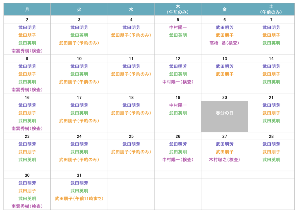 | 武田 明芳 | 外科、内科、胃腸科、肛門科、消化器内視鏡、腹部超音波、整形外科 |